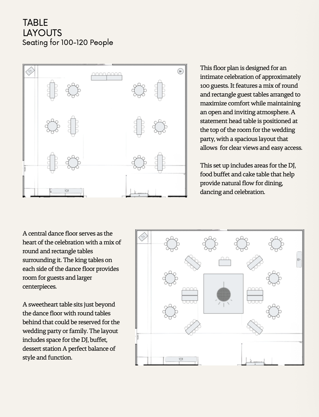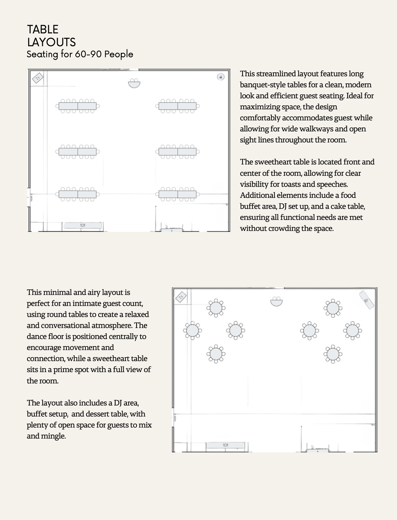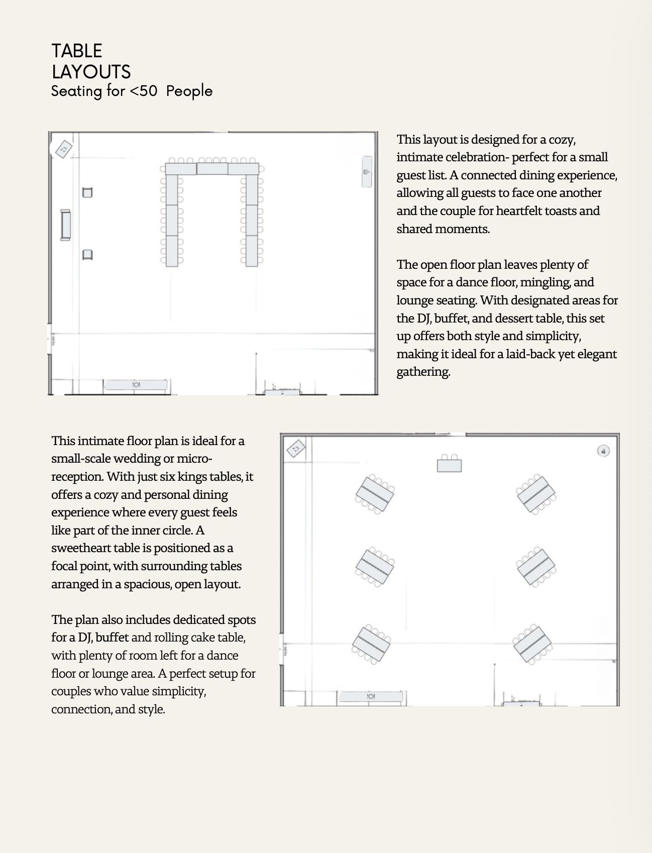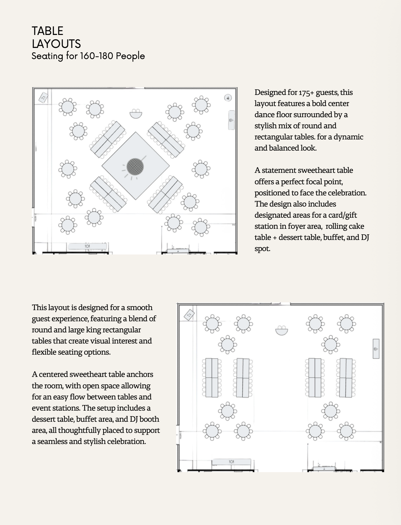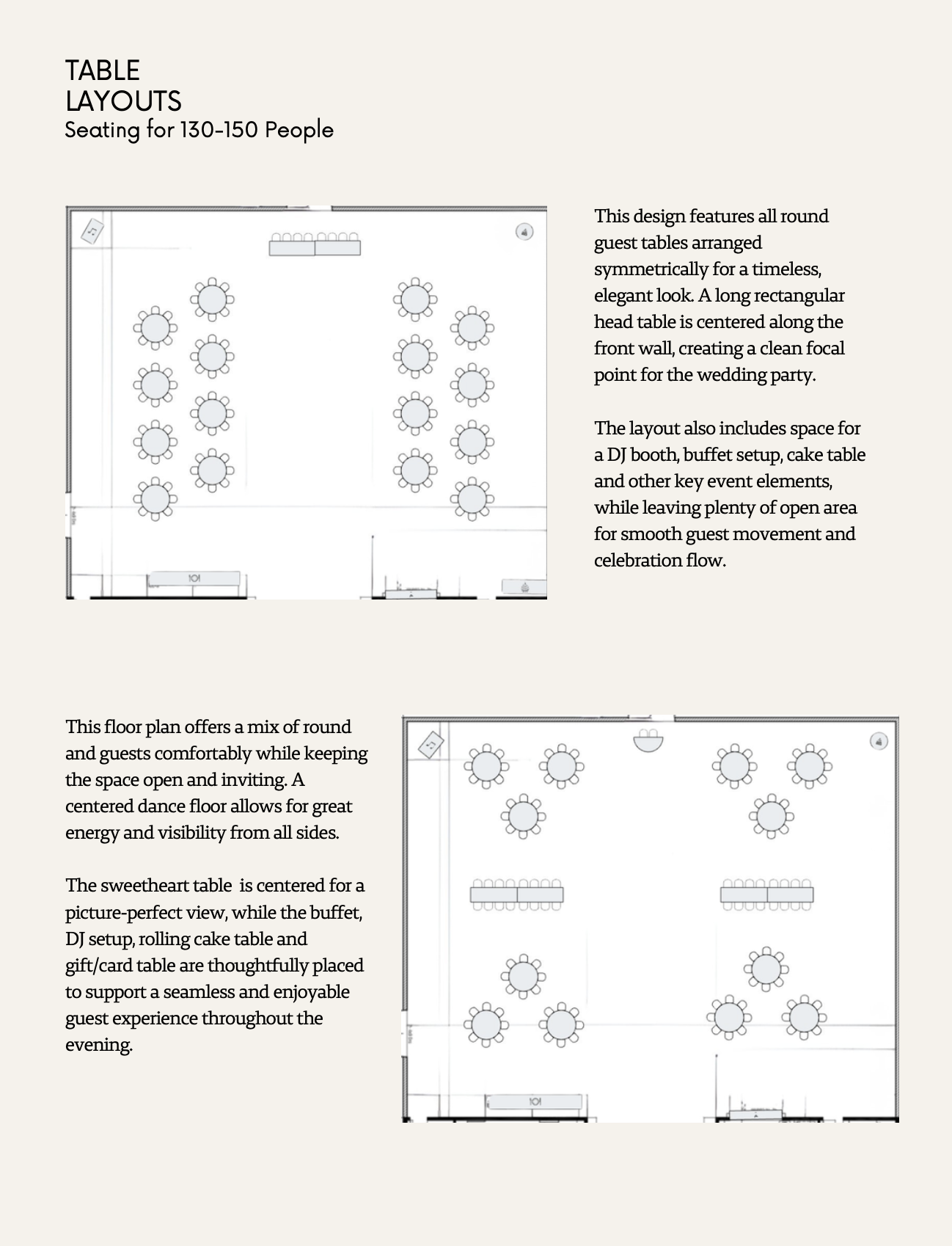 These layouts were created to maximize flow, functionality, and overall guest experience, and are intended to serve as inspiration rather than a fixed plan. Each layout can be adjusted to fit your guest count and personal vision. For event design, rentals, and day of coordinating services, we highly recommend working with Kayla at Signature Event Rentals and Coordinating.